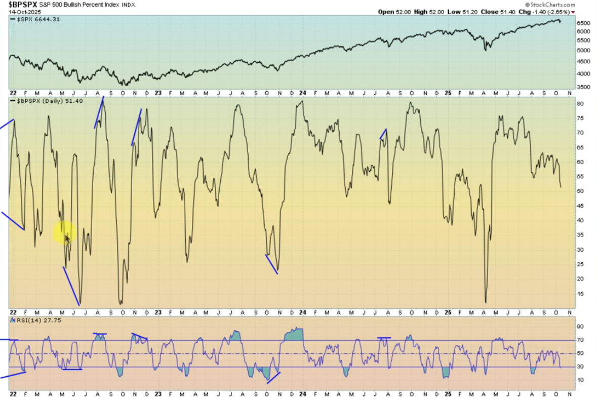 Let’s take a look at the BPI for a broader group of stocks in order to confirm the consistency of the divergence signals observed above. Here is the BPI for SPX: