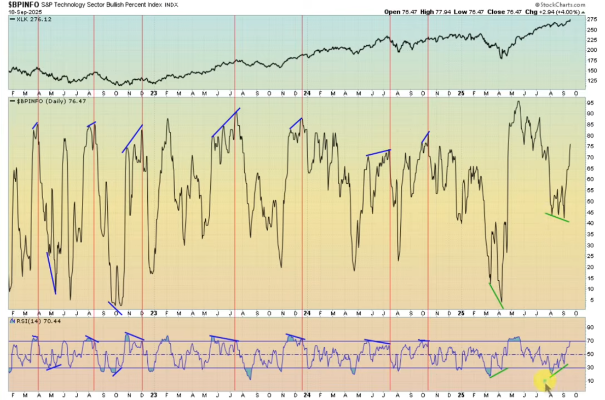 Firstly, oversold (RSI < 30) and overbought (RSI > 70) momentum readings are still applicable (read more here). Secondly, and more importantly, divergences between a BPI and its RSI have historically signaled opportune moments to buy or sell.