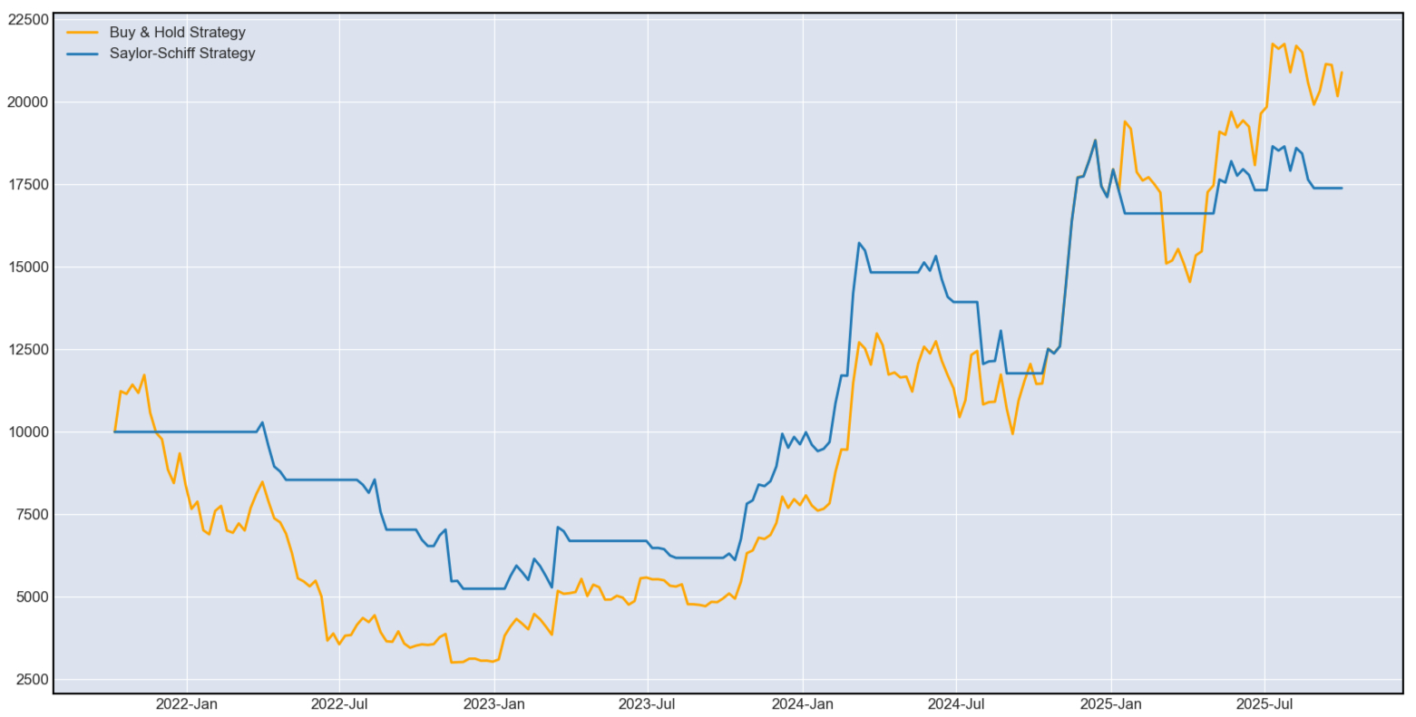 It can be observed that the Saylor-Schiff strategy suffered less drastic drawdowns during the 2022 bear market at the cost of reduced participation in later rallies.