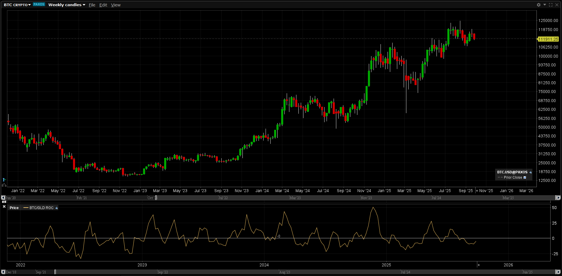 This makes sense because positive ROC readings correspond to periods where Bitcoin was outperforming Gold (the Bitcoin-to-Gold ratio was increasing), whereas negative readings correspond to periods where Gold was outperforming Bitcoin (the Bitcoin-to-Gold ratio was decreasing).